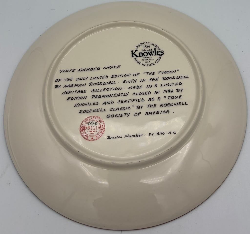This distinguished collectible represents the sixth installment in the prestigious Rockwell Heritage Collection, featuring Norman Rockwell's iconic "The Tycoon." Produced exclusively by Knowles in a carefully controlled limited edition that concluded in 1982, this plate bears official certification as a "True Rockwell Classic" from the Rockwell Society of America. A treasured piece for serious collectors and admirers of Rockwell's masterful storytelling through art.
