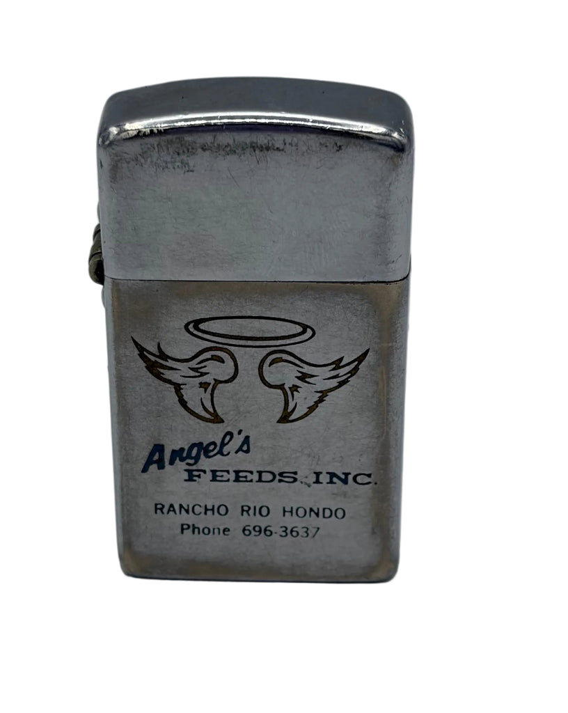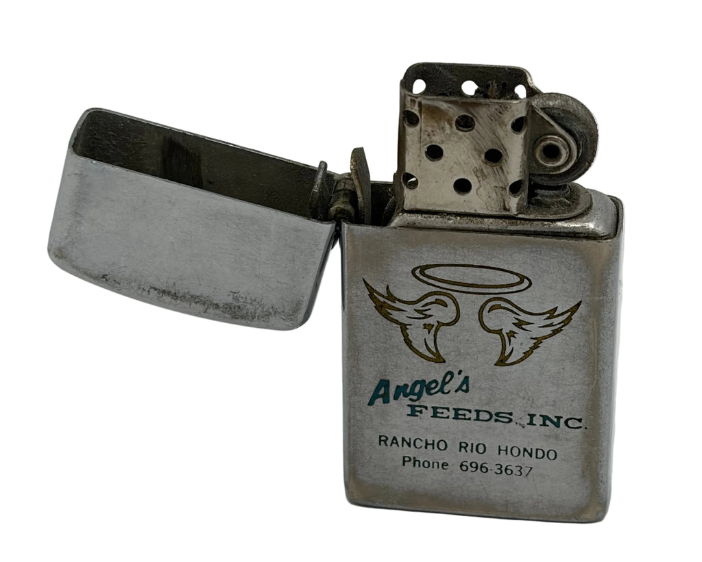 Authentic vintage promotional lighter customized for Angel's Feeds Inc, a Rancho Rio Hondo agricultural business. This period piece features classic Zippo-style construction with embossed branding and contact details, representing mid-20th century farm supply marketing. Perfect for collectors of vintage advertising memorabilia, agricultural history buffs, or anyone seeking authentic Americana. The sturdy metal design has stood the test of time, making it both a functional collectible and a window into rural business heritage.