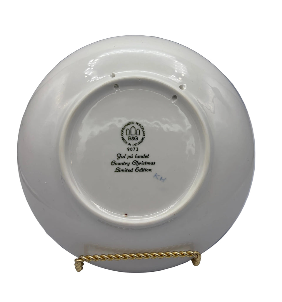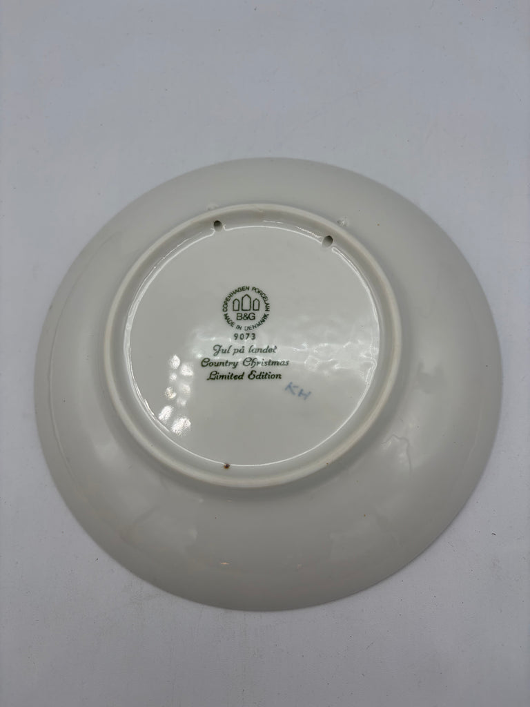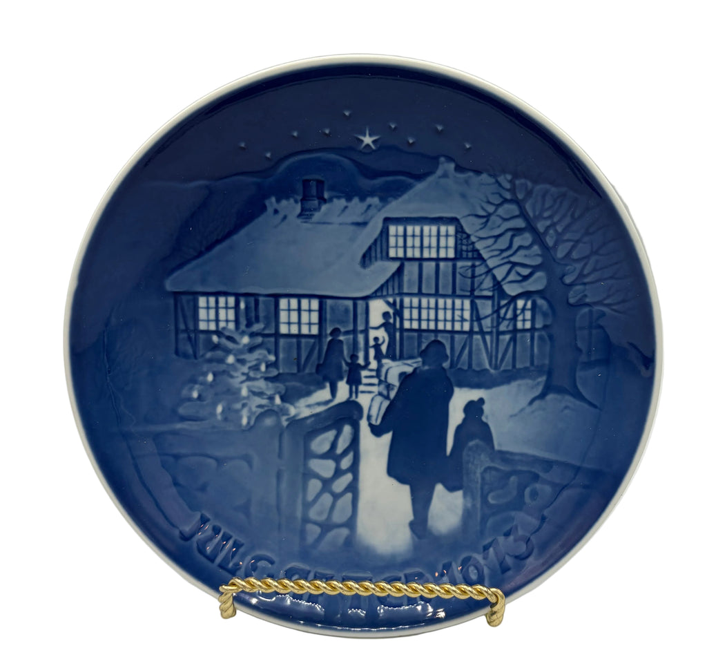 A distinguished Bing & Grøndahl porcelain plate from 1973, this Copenhagen-crafted collectible showcases Henry Thelander's elegant blue and white composition of a family's Christmas visit to a rural farmstead. As part of the brand's limited edition series, each plate was produced with molds subsequently destroyed, ensuring exclusivity. The piece arrives in its original packaging, making it an exceptional addition to holiday or Scandinavian design collections. A timeless representation of mid-century artisanal craftsmanship.
