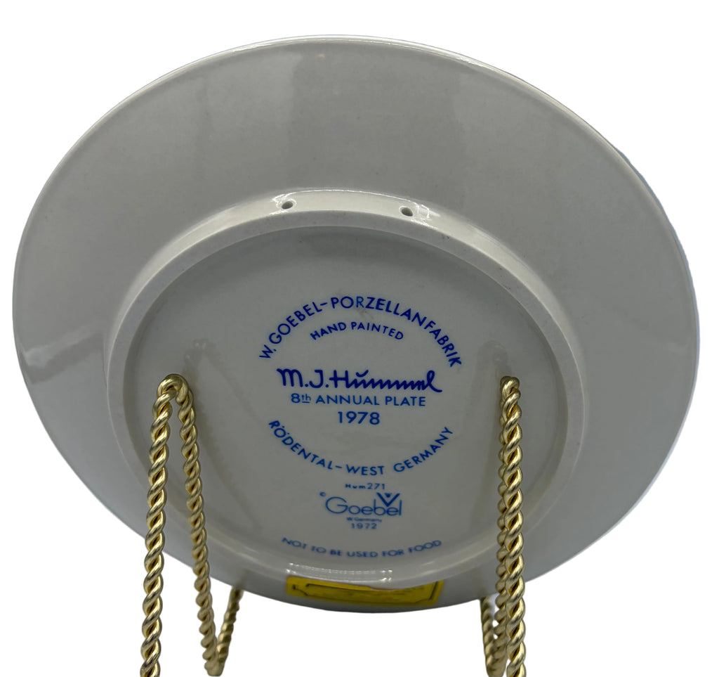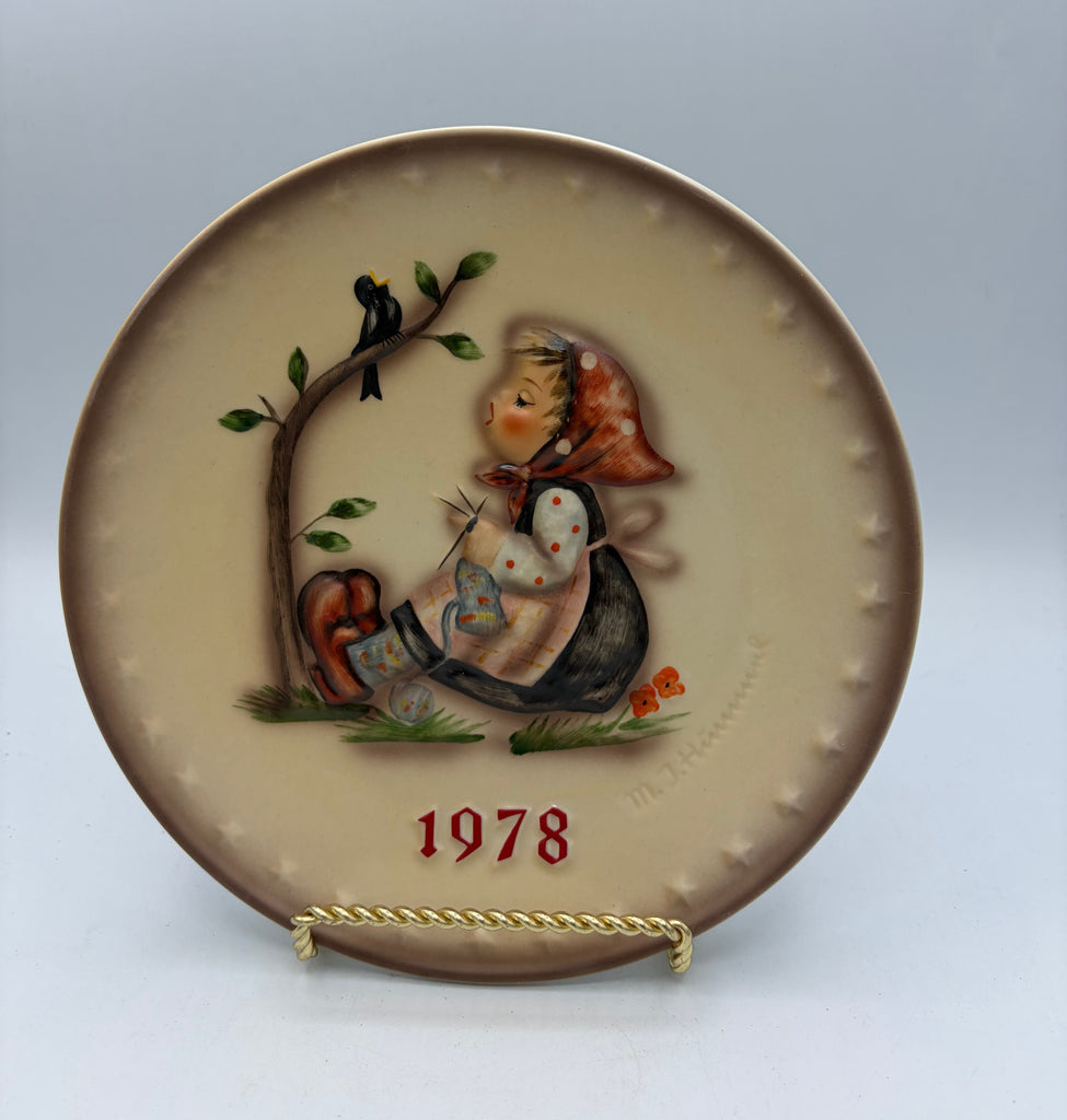 Celebrate a cherished piece of collectible history with this 1978 Goebel M.J. Hummel "Happy Pastime" plate. The eighth edition in the beloved annual series showcases exquisite bas-relief artistry—a serene young girl absorbed in her knitting beneath a sheltering tree, accompanied by a delicate bird. Crafted in West Germany by the renowned Goebel manufactory, this 7.5-inch treasure exemplifies the hand-painted refinement characteristic of Hummel's timeless aesthetic. A distinguished addition to any collector's cabinet, whether displayed as a standalone statement piece or as part of a curated series.