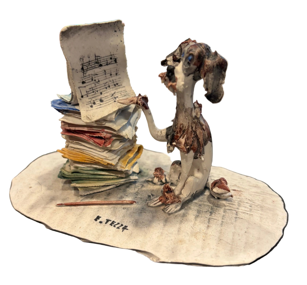 Discover this exquisite vintage Italian ceramic figurine, a treasured example of artisanal craftsmanship from the Lo Scricciolo school. Hand-sculpted and meticulously hand-painted, this charming canine subject captures a moment of musical contemplation, gazing thoughtfully at sheet music. Attributed to the celebrated artist Toni Moretto, the piece exemplifies the rustic elegance and expressive character that define this iconic ceramic tradition. A refined addition to any collection of European decorative arts.