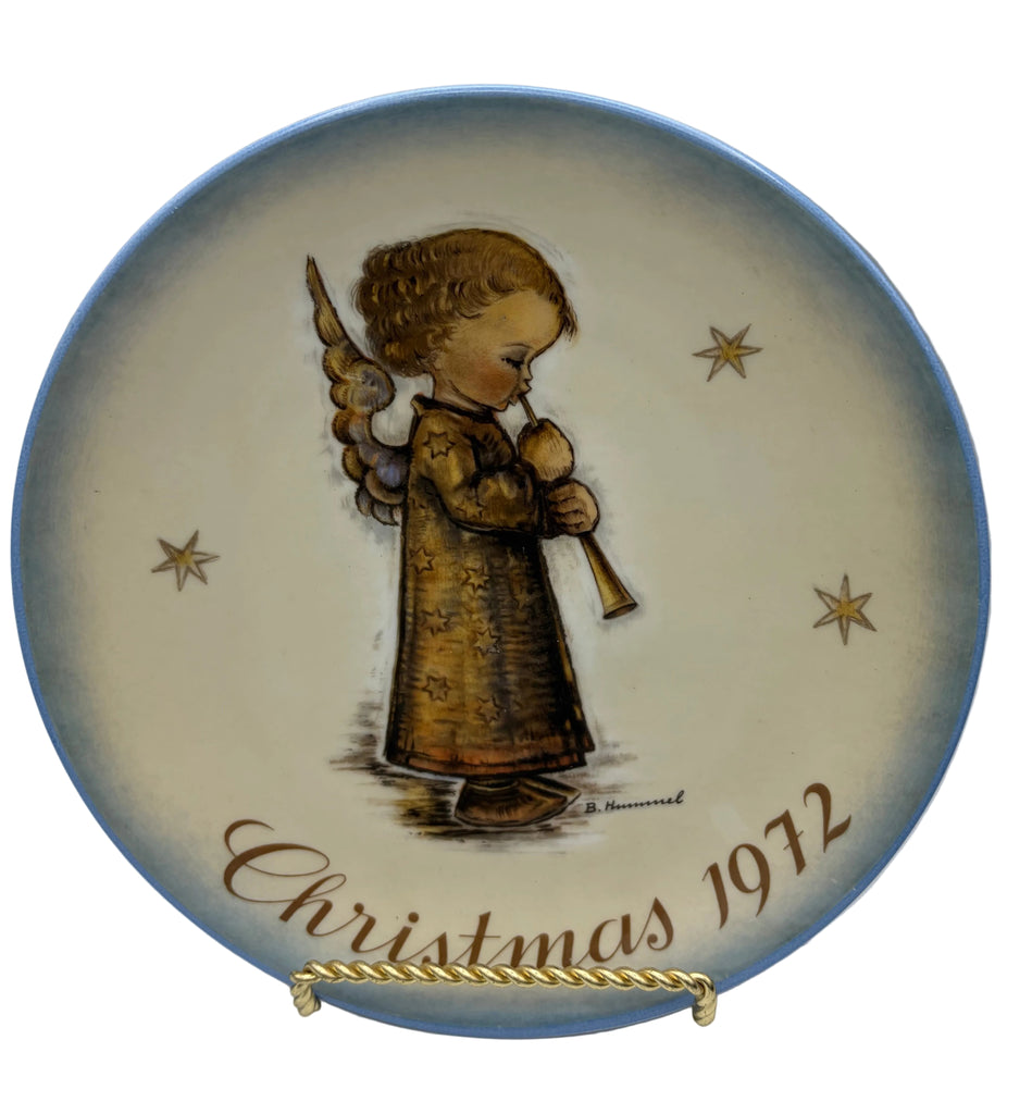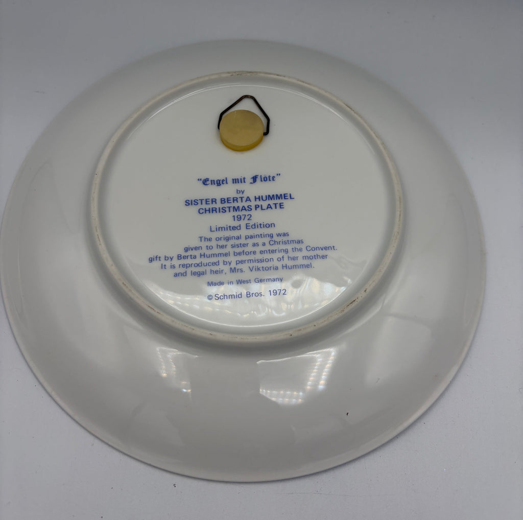 - This charming 1972 Hummel collector plate brings a touch of heavenly whimsy to any collection! Titled "Angel with Flute" (Engel mit Flöte), it showcases a delightful angelic figure in a playful musical moment. As the second installment in the beloved Schmid collector series, this piece celebrates the timeless artistry of Sister Berta Hummel, the celebrated Bavarian artist whose work has enchanted collectors for generations. Crafted with care in West Germany by Schmid Brothers, this vintage treasure measures a perfect 7.75 inches across—ideal for display on a shelf or wall. A delightful addition for Hummel enthusiasts and vintage holiday collectors alike!