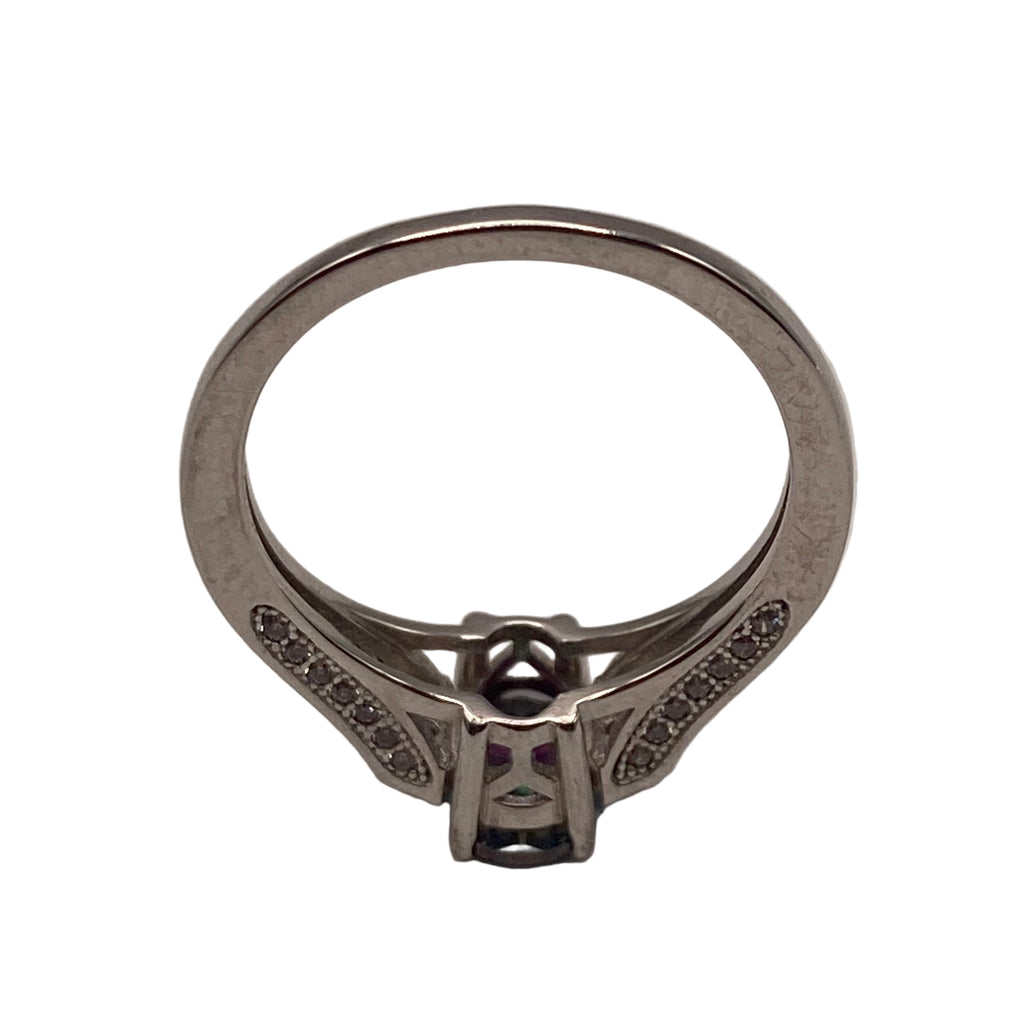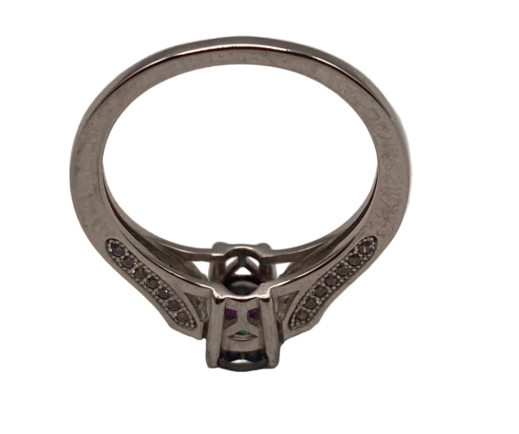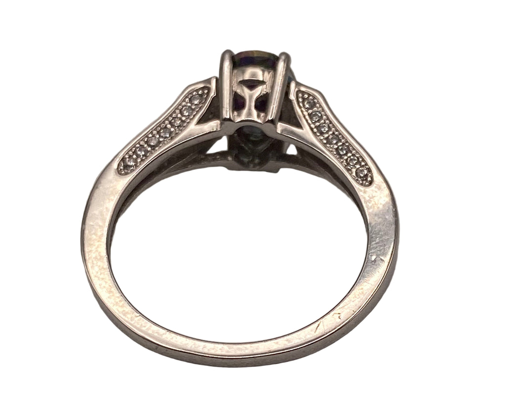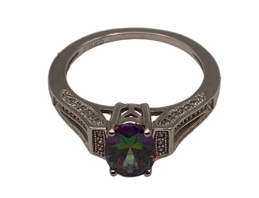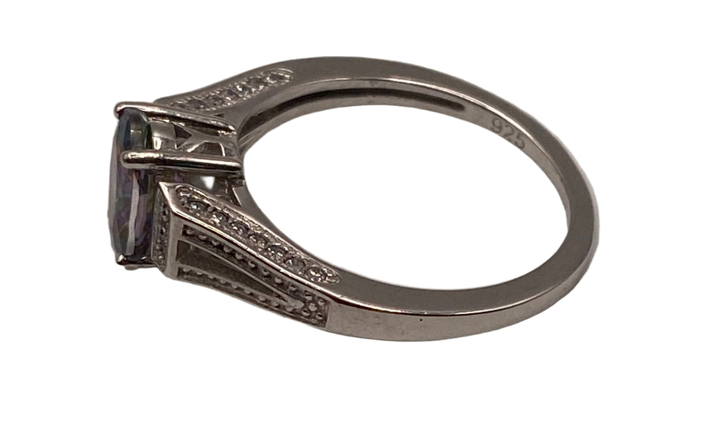 This Size 7 ring features a 925 silver band adorned with a mystic topaz and 34 sparkling clear cubic zirconia stones for an elegant touch.