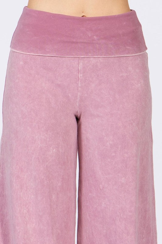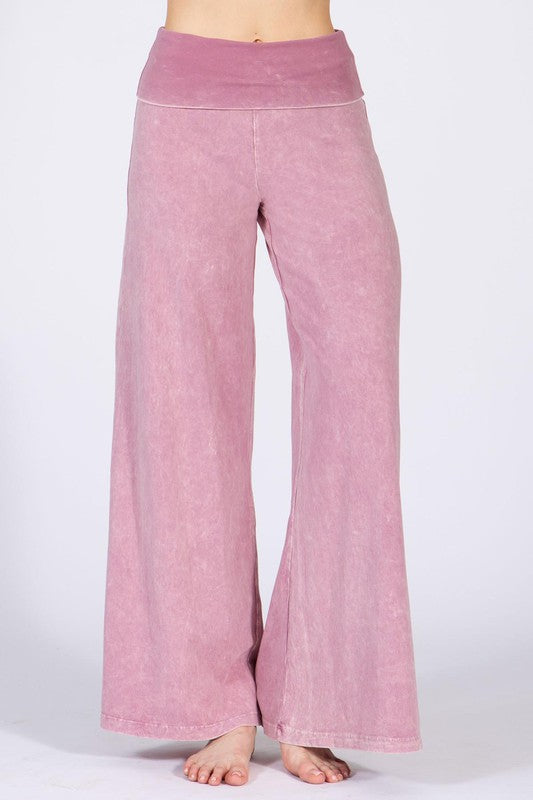 Soft and stretchy mineral wash wide leg pants with a wide fold-over waistband for comfort and support.