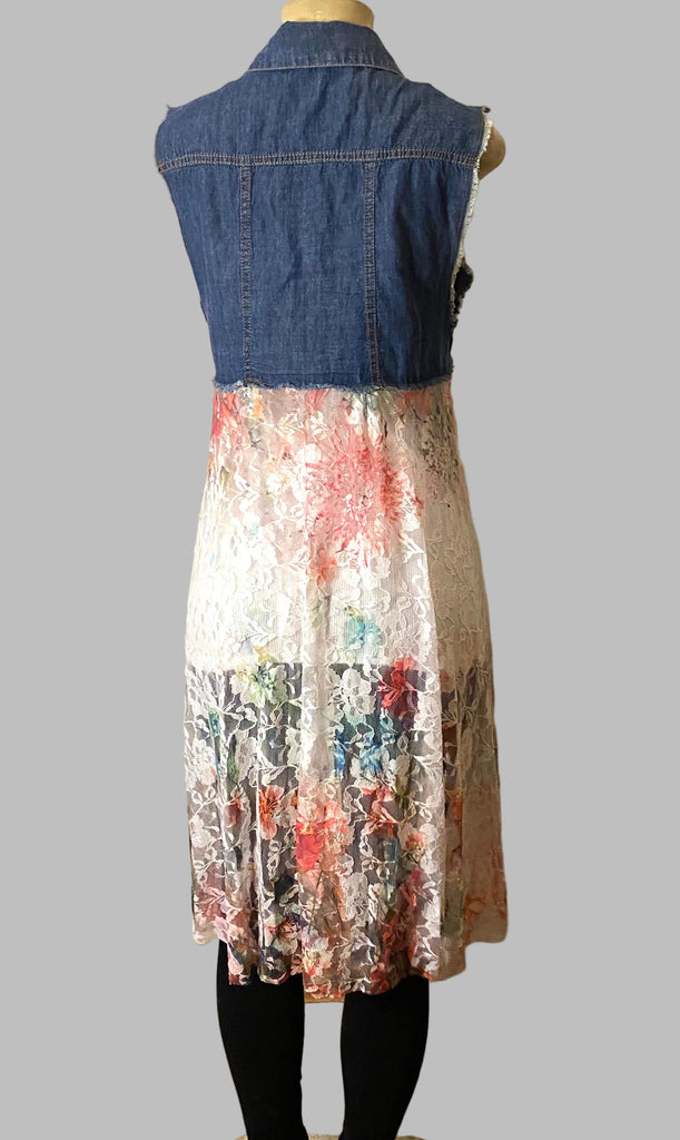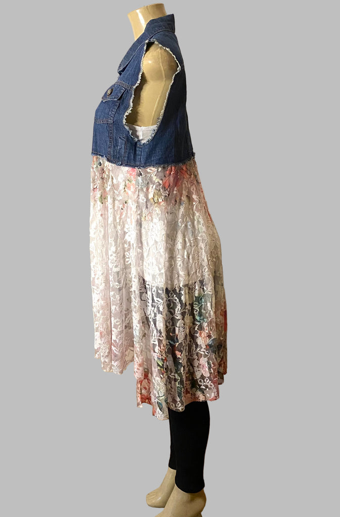 This Origami Jean Lace Vest features convenient pockets and a button-up front. With its stylish hi-lo hemline, it's crafted from 100% cotton and 100% polyester. Care is simple with hand washing, and it measures 20 inches across from armpit to armpit.