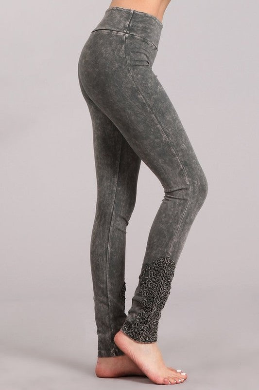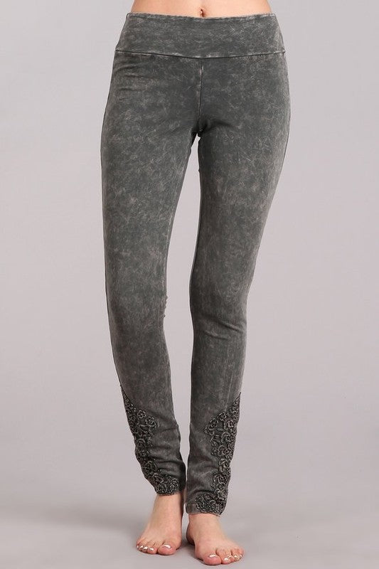 These leggings feature a banded waist and embroidered patches, with a unique mineral wash for a one-of-a-kind finish. Due to the hand-dyed process, the color and finishing may vary, adding to the individuality of each piece. Made in the USA using a 93/7 Cotton/Spandex jersey blend.